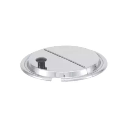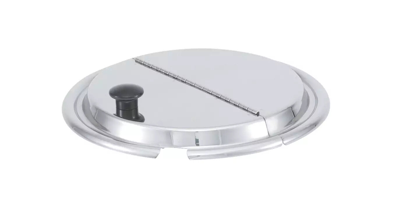 The Overview has mirror-finish stainless steel cover has a welded clip on the stationary side to hold it securely in place. It features a slot for a ladle or spoon. The Kool-Touch handle is heat-resistant, and the cover is easily operated with one hand.
