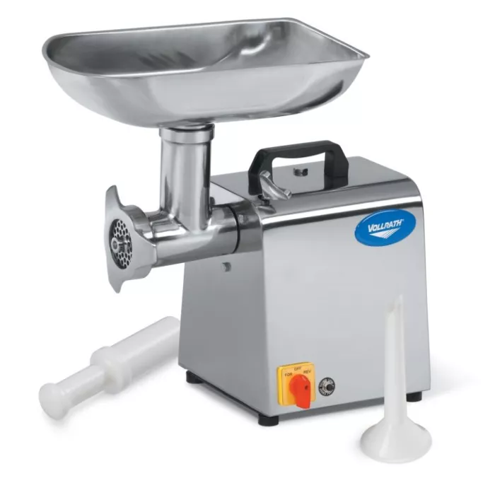 Efficient and reliable under demanding conditions, the No. 12 meat grinder by Vollrath is the ideal product for butchers, supermarkets, restaurants, delis, and more. This grinder has a stainless steel body with no sharp corners or seams, and the feed tray holds large amounts of meat at once, while the pusher helps you feed the product down the chute. The 1-HP energy-efficient motor and precision gear drive easily grind 264 pounds of meat per hour, and a forward and reverse switch allows for higher-quality grinding. Nonskid feet maintain stability, and the grinding head, pan, and attachments are dishwasher-safe, ensuring a quick cleanup.