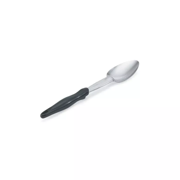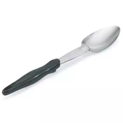 Heavy-gauge stainless steel shaft and bowls - resistant to corrosion. High temperature patented nylon handle - heat resistant to 450°F (232°C). Ergonomic handle is comfortable and reduces hand fatigue. Built-in stopper notch prevents spoon from sliding into food product. Textured surface on handle prevents slippage while in use. One-piece construction is extremely durable and has no crevices to collect water or bacteria. Unique bowl shape with contoured end fits corner of pans - reducing food waste and maximizing serving efficiencies. 3-sided spoon has a straight-sided "cutting" edge to aid in serving solid, sticky, or cheesy food products.