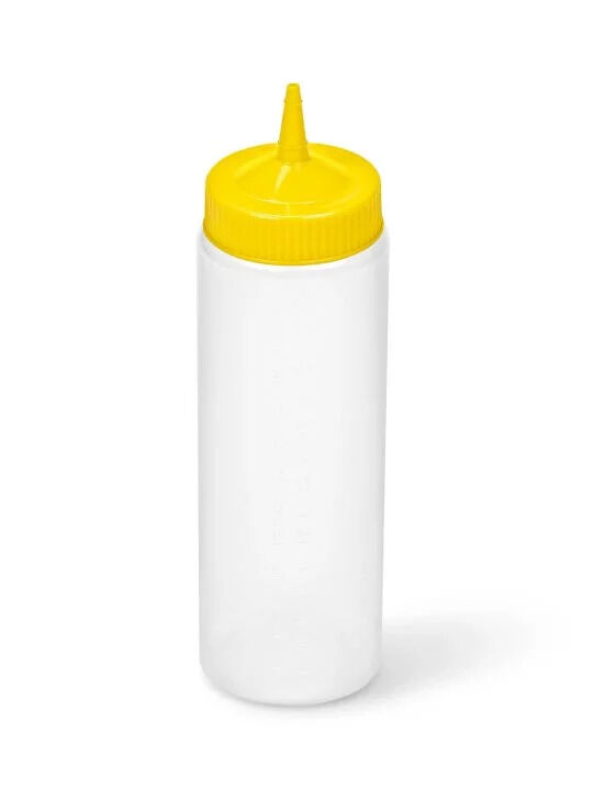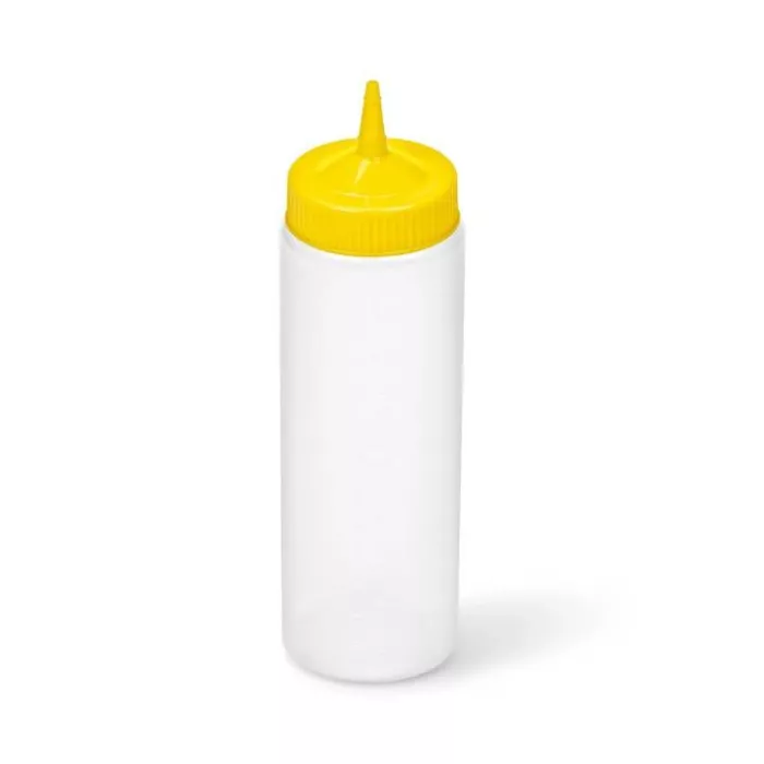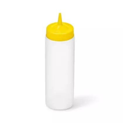 Provide easy access to popular condiments with the Traex Color-Mate single-tip wide-mouth squeeze dispenser by Vollrath. With this dispenser, you'll be able to provide easy, mess-free service, every time! The durable yet flexible polyethylene construction is easy to squeeze for fast service, and the clear bottle offers excellent visibility, allowing you and your guests to identify the contents at a glance. Meanwhile, the yellow top fits perfectly into your color-coded system. The single tip allows for impressive precision and control during dispensing. Cut the tip to dispense more viscous sauces, or leave as is for thinner liquids. Thanks to the clearly embossed capacity graduations, it's easy to monitor and control portions. The wide mouth ensures easy refilling, and both the bottle and the top are dishwasher safe, for fast, convenient cleaning.