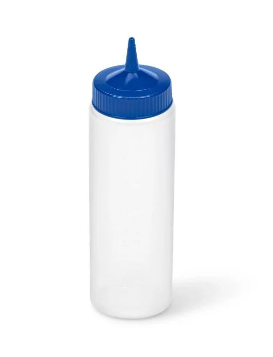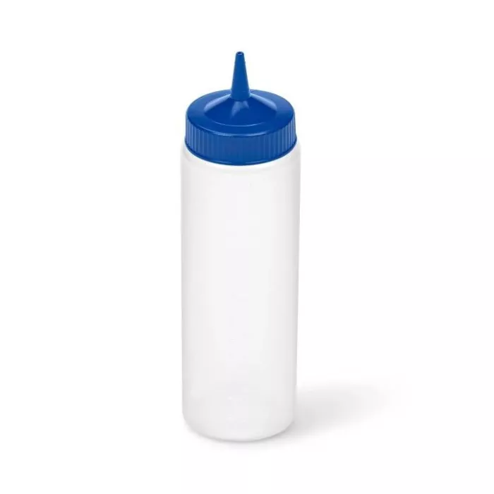 Provide easy access to popular condiments with the Traex Color-Mate single-tip wide-mouth squeeze dispenser by Vollrath. With this dispenser, you'll be able to provide easy, mess-free service, every time! The durable yet flexible polyethylene construction is easy to squeeze for fast service, and the clear bottle offers excellent visibility, allowing you and your guests to identify the contents at a glance. Meanwhile, the blue top fits perfectly into your color-coded system. The single tip allows for impressive precision and control during dispensing. Cut the tip to dispense more viscous sauces, or leave as is for thinner liquids. Thanks to the clearly embossed capacity graduations, it's easy to monitor and control portions. The wide mouth ensures easy refilling, and both the bottle and the top are dishwasher safe, for fast, convenient cleaning.