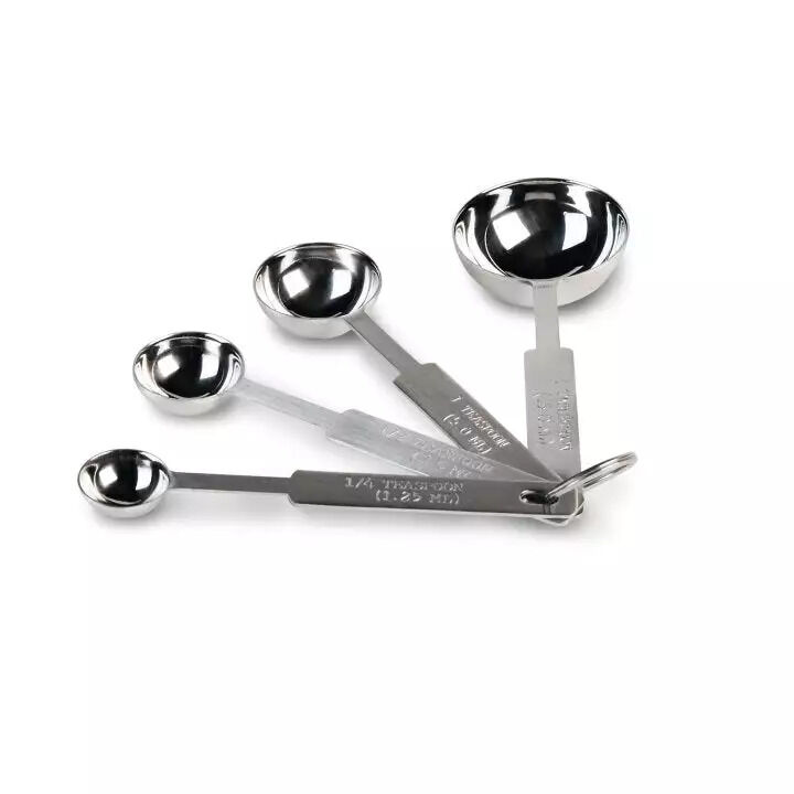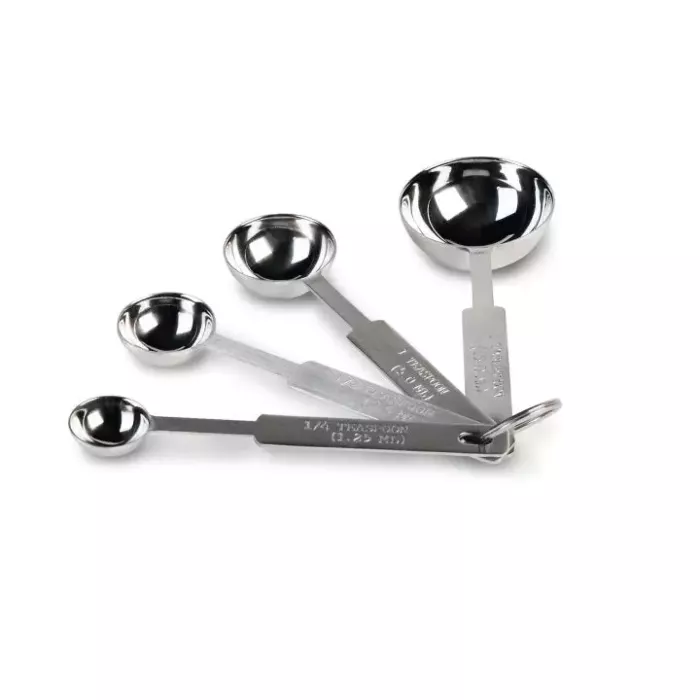 Easily meet all of your measuring needs with the Overview. This stainless steel four-piece set includes one 1 tablespoon, 1 teaspoon, ½ teaspoon and ¼ teaspoon, all of which are secured together with a stainless steel ring for your convenience. Each spoon handle is stamped with the capacity in both English and metric scales for quick identification, and the stainless steel construction promises years of reliable service.