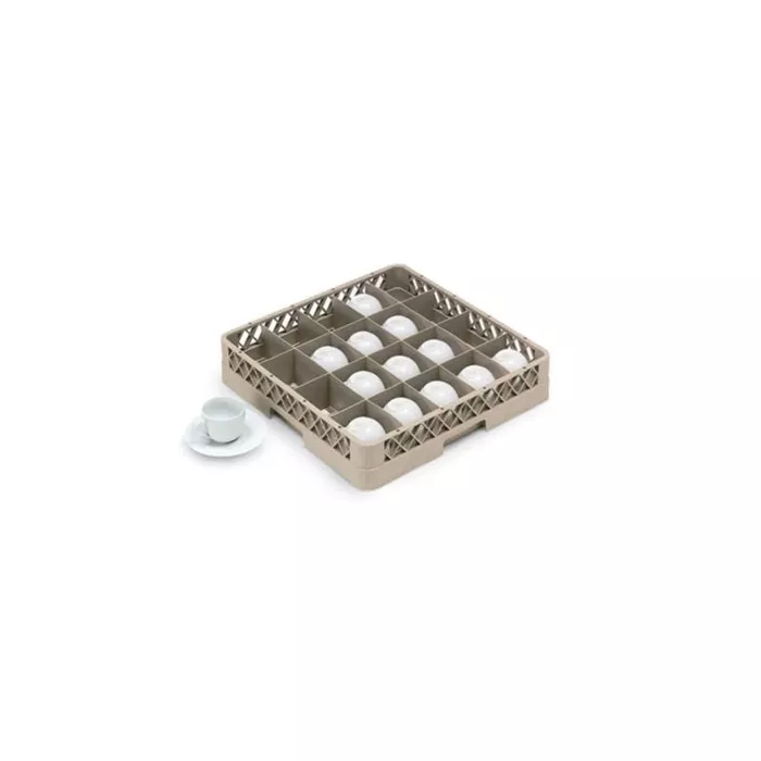 Molded in tilt bar prevents water from pooling, leaving spot free glassware. 3" high compartment dividers for vertical protection. Outside dimensions: 19 3/4" x 19 3/4" (50 x 50 cm).
