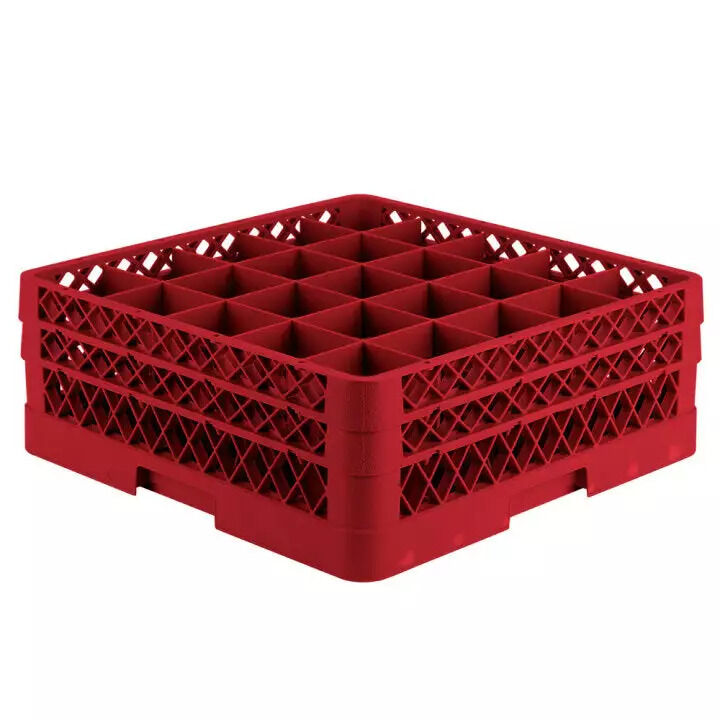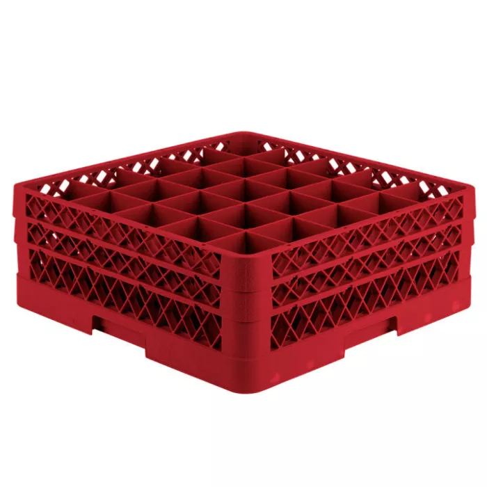 The strength of the Traex full-size glass rack by Vollrath is unmatched. Made of copolymer plastic to ensure chemical, impact and heat resistance up to 180°F for 30 minutes, this rack is impressively durable. The open profile allows top-to-bottom and side-to-side washing, as well as air circulation for superior cleaning and drying, while the built-in rack dividers provide 100 percent vertical protection for your glassware. Compartments maximize space, and the extenders create ample room for tall glasses. Handles on all four sides of the rack ensure easy gripping and transportation, while reinforced index strips allow for four-way tracking. The red color allows this rack to fit into your color-coded system perfectly.