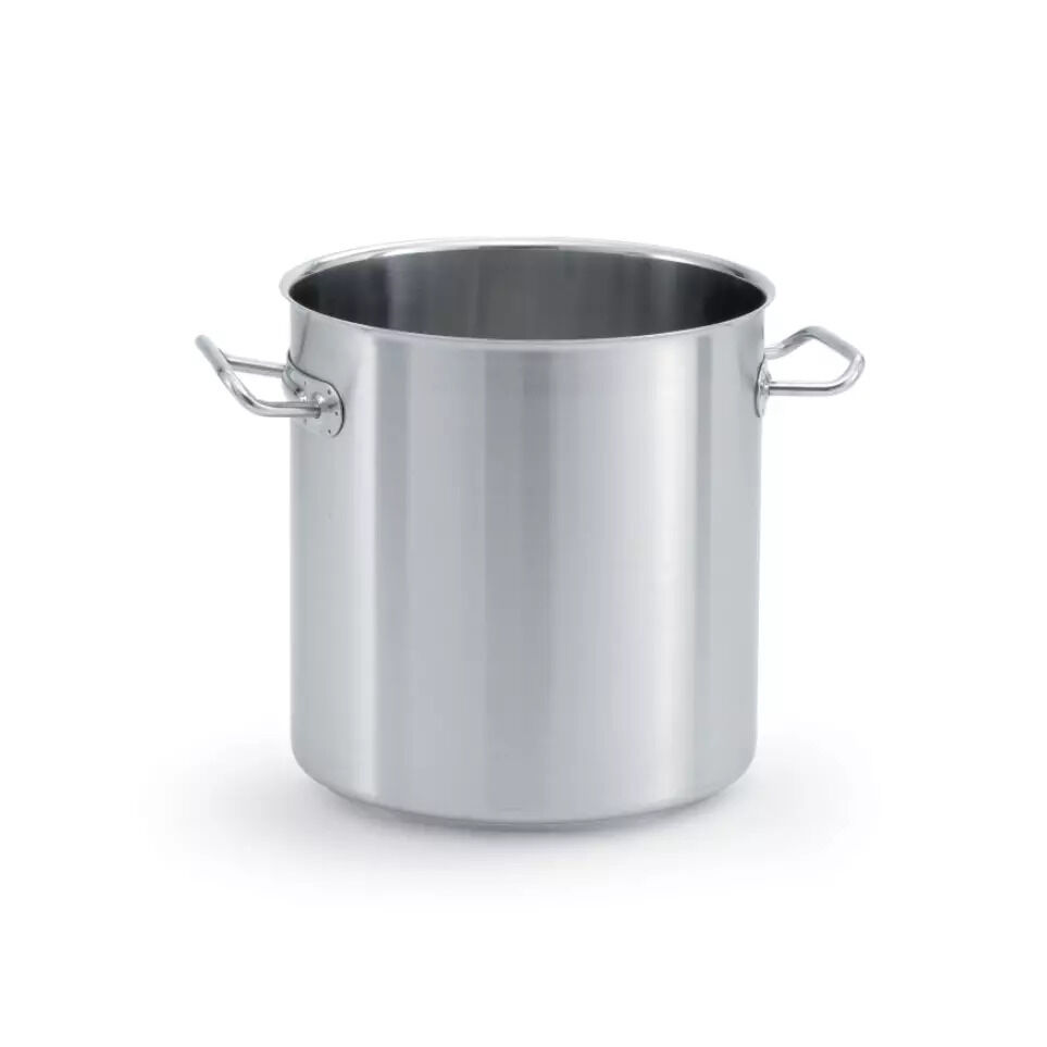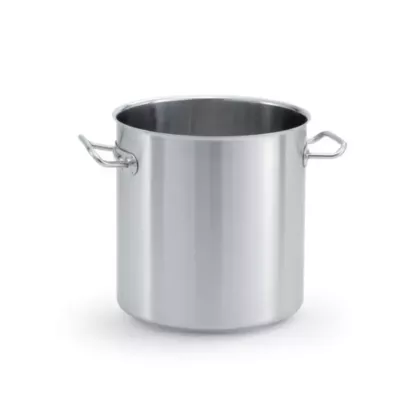 The Intrigue stockpot by Vollrath is designed to improve efficiency in your busy commercial kitchen while maximizing flavors. Made of heavy-duty stainless steel, this stockpot is durable, long-lasting, and it ensures even heating and uniform cooking. The mirror-finish exterior gives this stockpot a beautiful appearance, and strong stainless steel handles provide a steady grip and convenient transportation. This stockpot is oven- and dishwasher-safe for added versatility and easy cleaning, while the rounded lip allows mess-free pouring.