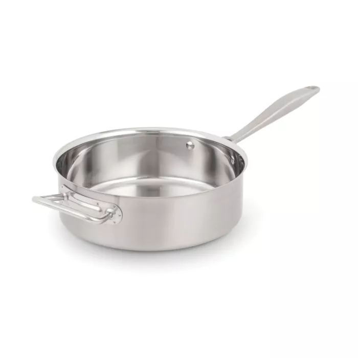 Introducing the Intrigue Sauté Pan by Vollrath, designed for induction ranges and offering exceptional efficiency, versatility, and performance. This 6-quart pan is made of heavy-duty 18-8 grade stainless steel, ensuring durability and longevity. The thick, permanently bonded bottom layer guarantees consistent heating and uniform cooking results, while the mirror-finish exterior adds a touch of elegance to your kitchen. The patented ergonomic riveted handle stays cool to the touch and provides a comfortable grip, while the convenient helper handle improves maneuverability. This sauté pan is oven- and dishwasher-safe, and its rounded lip allows for mess-free pouring. Covered by a lifetime limited warranty, this NSF-certified pan is perfect for sautéing, browning, frying, and more.