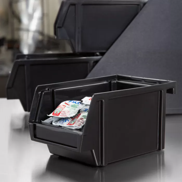 Constructed from durable plastic, this bin is built to last and promises years of service. The flat space at the front of the bin provides room for labels, allowing you to keep items organized and easily located. The open design ensures easy access and quick refilling, making it a breeze to keep your self-service area fully stocked and running smoothly.