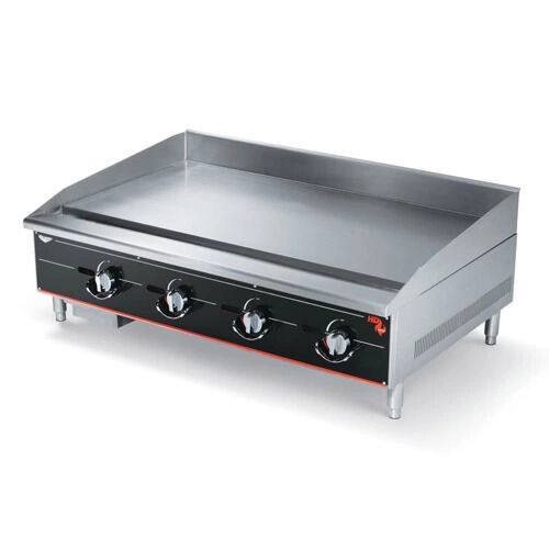 • Dimensions: 48"; 24" cooking surface depth; 5" sloped side splashes; 5" backsplash; 4" adjustable legs