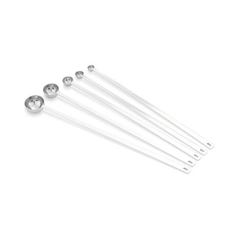 14" long handle is designed for commercial size spice jars. The seamless construction provides greater durability and easy cleaning. Capacities are clearly stamped for easy identification. Set contains 5 spoons