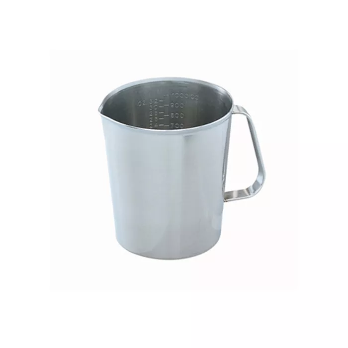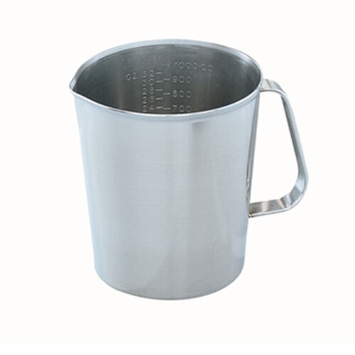 18 gauge 300 series stainless steel. Easy-to-read graduation marks in ounces and cc's on inside. Pouring spout and welded comfortable handle for ease of use. Beveled lip.
