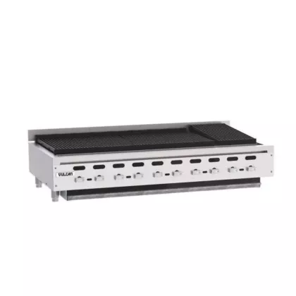 Dimensions: 62.1" wide x 31" deep x 12" working height All welded chassis with stainless steel sides, control panel, top trim, backsplash and grease trough Heavy duty cast iron char-radiants 5.25" wide cast iron diamond grates One 17,000 BTU/hr burner for each broiler grate Easy lighting standing pilot ignition system One high range infinite heat control valve for each burner. Valve adjustment marks engraved into front panel for easy set-up Heat deflector tray system reflects heat upwards creating a “Cool Zone” in the grease drawer and facilitates easier cleaning. 4" adjustable legs 3⁄4" rear gas connection and gas pressure regulator Supercharger burner dividers minimize heat transfer to enhance multi-zone cooking capability