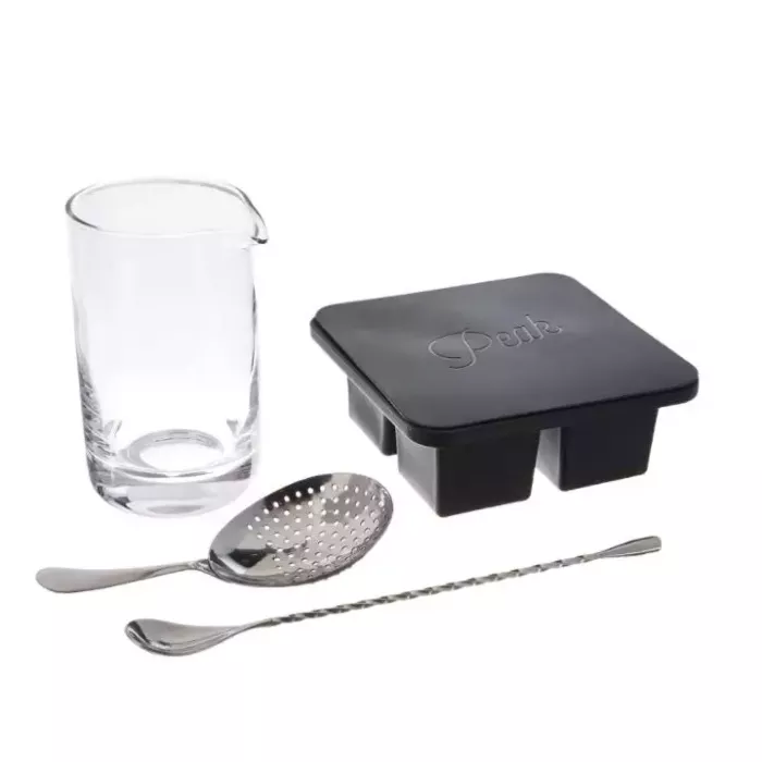 Kit Components: Bar Spoon, Julep Strainer, Mixing Glass, Extra Large Ice Cube Tray