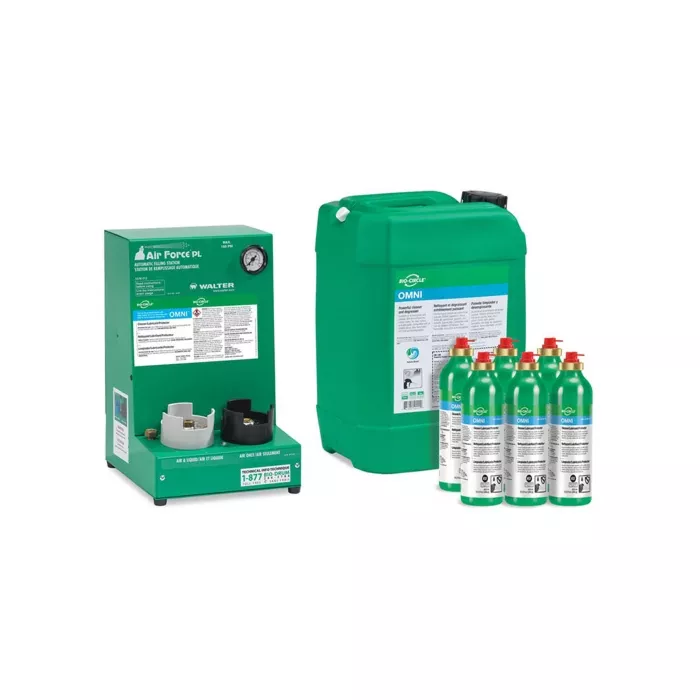 - Comprend: (1) poste Air Force(MC) OMNI(MC), (1) bidon de 20 litres AF-OMNI(MC), (1) adaptateur pour seau, (6) bouteilles reremplissables, (6) pulvérisateurs à jet variable