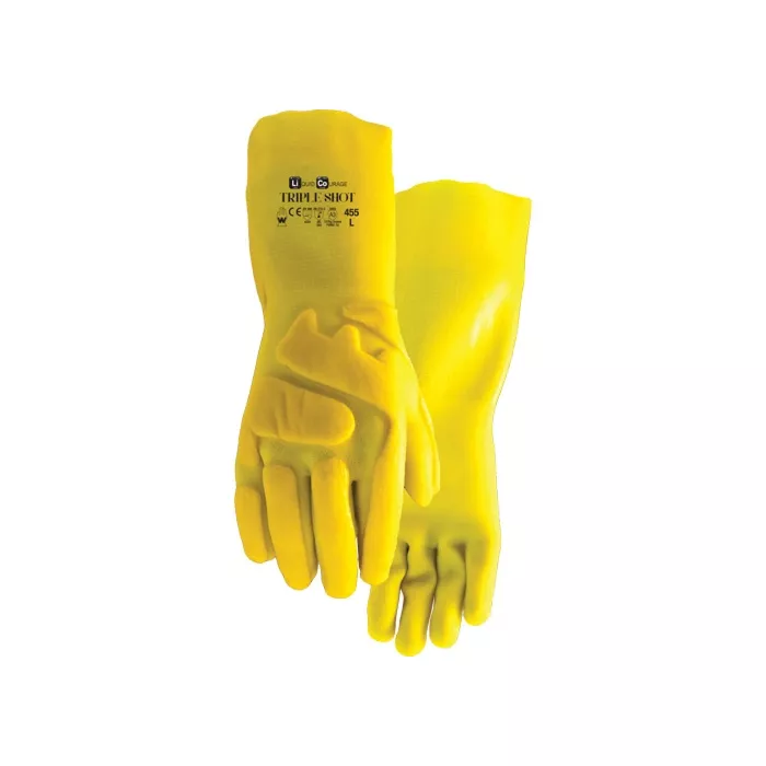 - PVC jaune haute visibilité entièrement enduit avec finition sableuse qui fournit une protection chimique contre le formaldéhyde (480 minutes), l'hydroxyde de sodium 40 %(>480 minutes) et l'acide sulfurique (>75 mins)