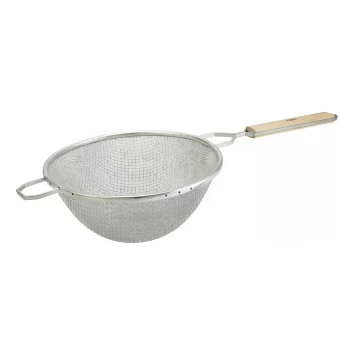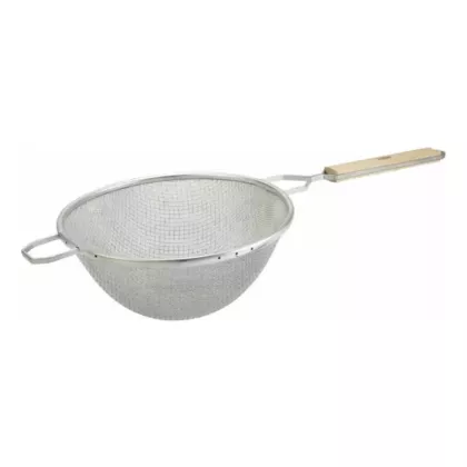 The Overview is with double fine mesh. It also consist of double fired plated steel and double fire tinned wooden handle. It is made from Stainless Steel and has tin-plated finish.