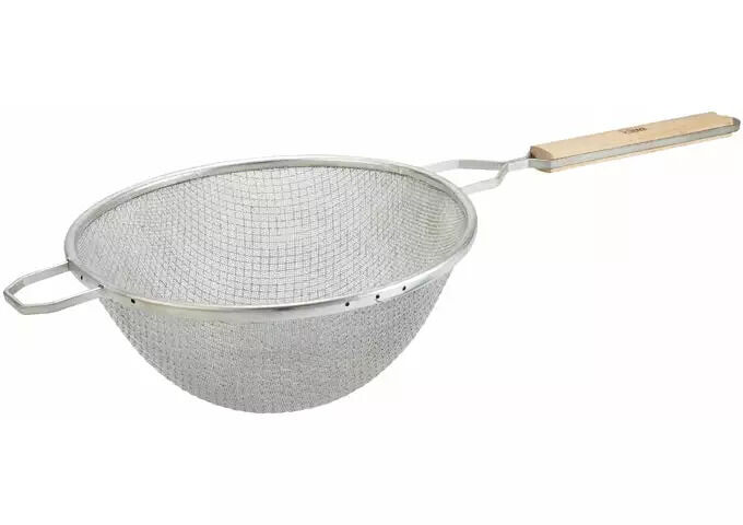 Strainer with single fine mesh and double fired tin plated steel. Wooden handle.
