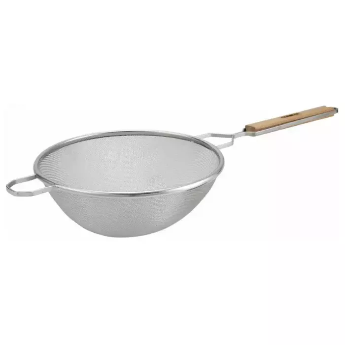 It features a stainless steel mesh basket with a diameter of 10 1/2 inches and is easy to handle with its wooden grip.