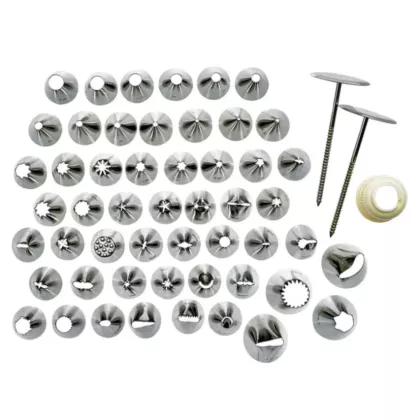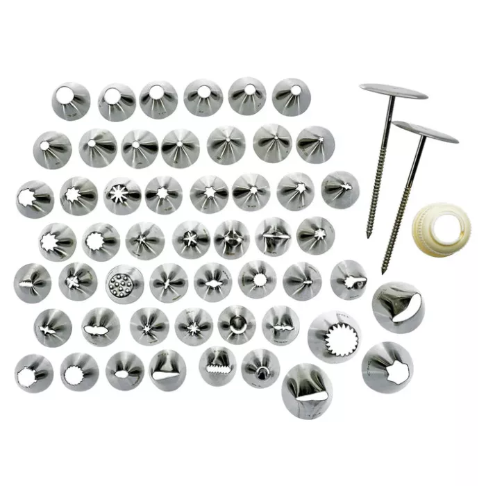 The Overview that can help you create delicate and pretty confections with these decorating tips made of rust-resistant stainless steel. Decorating tip sets come in a convenient storage box. The 26 and 52 piece sets include a standard coupler and metal flower nail. This is stainless steel cream nozzle set which consist of 52 pcs, 80.5" x 7" x 1.06"