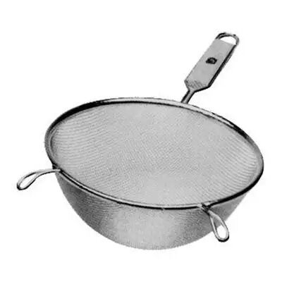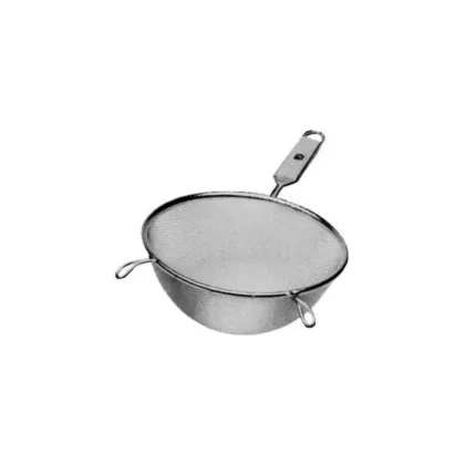 Strainer with single fine mesh. Double fired plated steel and double fire tinned wooden handle.