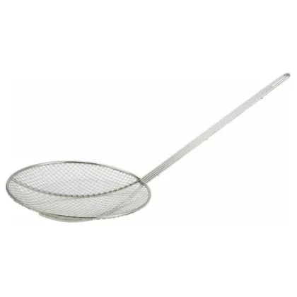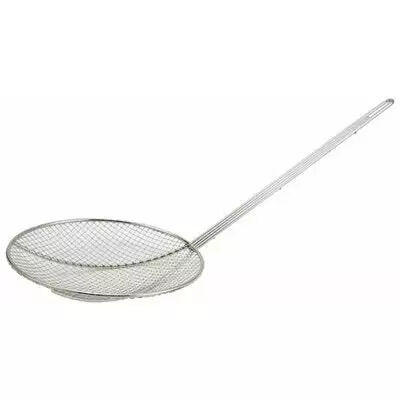 Primarily used for removing dumplings or meatballs from hot liquid, the Winco SC-9R Round Wire Skimmer 9" is also great for straining pasta and dusting baked goods with powdered sugar. This skimmer is designed with a concave net which prevents spills and messes while its meticulously placed perforations facilitate fast drainage.