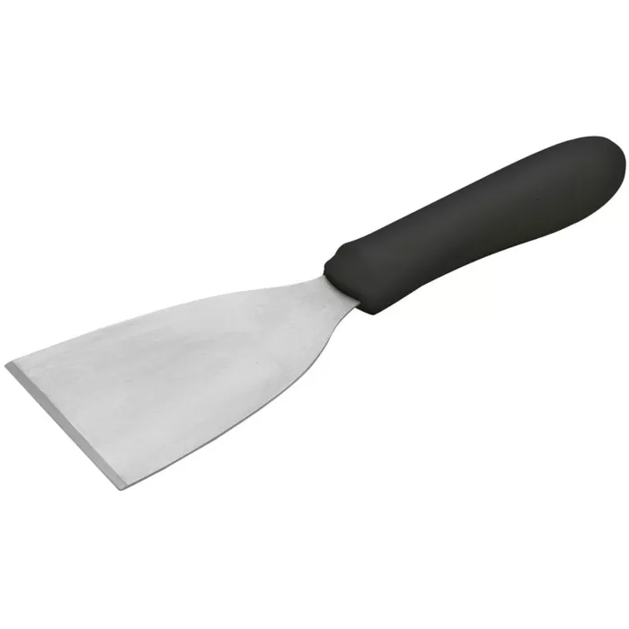 • This stainless steel pan scraper with plastic handle is useful for getting baked-on foods off of pans.