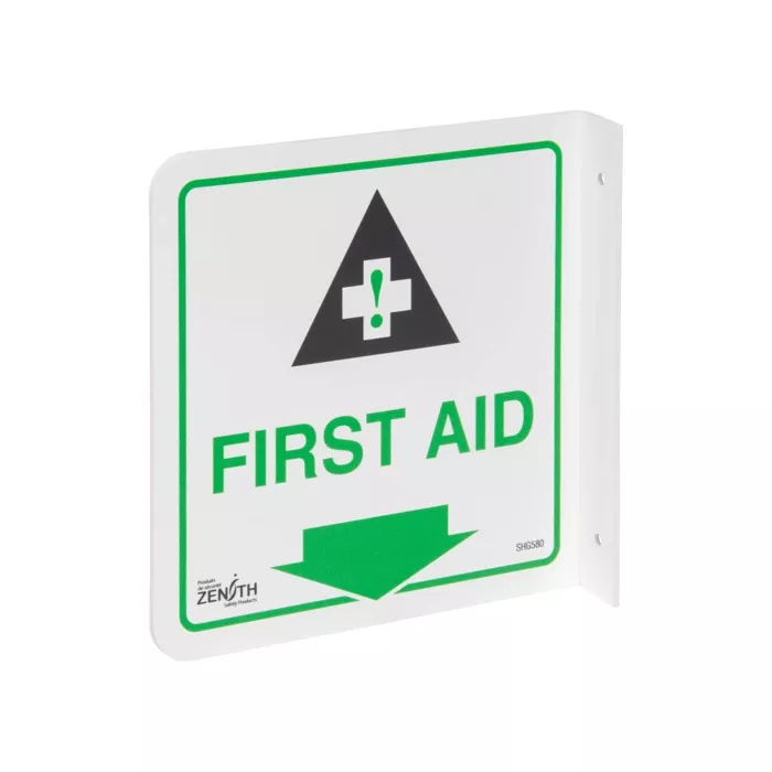 - Pictogramme et flèche directionnelle qui indiquent l'emplacement des ressources de premiers soins