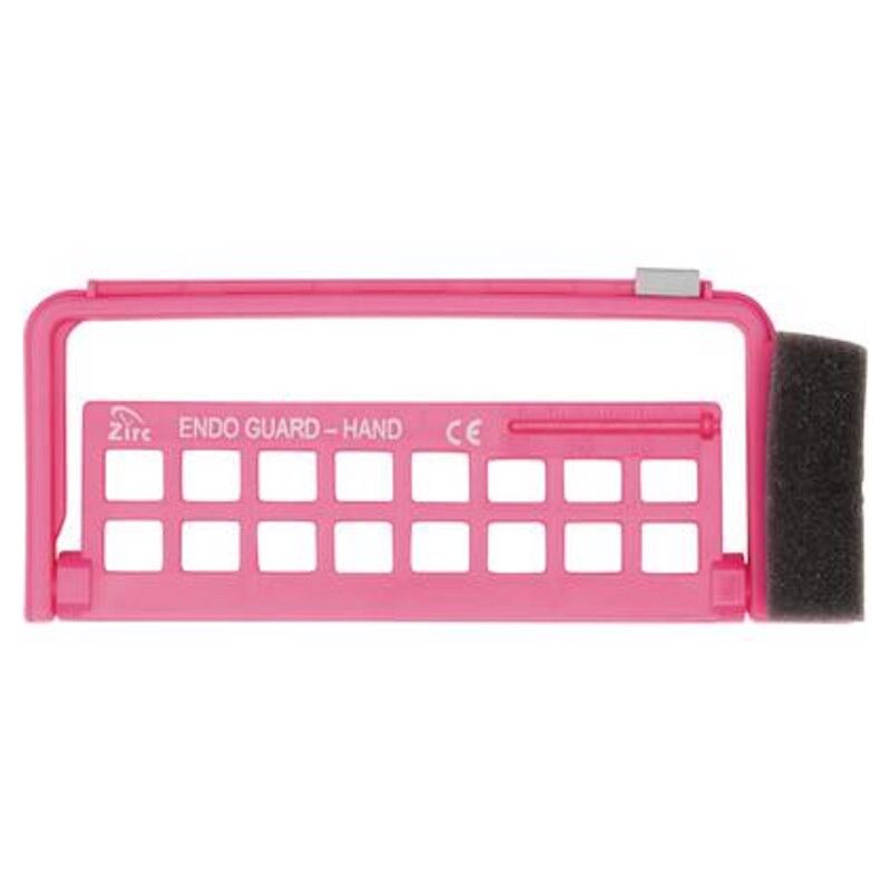 Endo Guard Hand is the perfect space to store almost any length hand file or reamer. It will keep your files safe from getting lost or damaged during reprocessing with the help of the ratcheting arm. That arm can be set in three different positions to be able to lock in the files. The Endo Guard Hand also provides great assistance during root canals by organizing your tools so they're easy to reach.