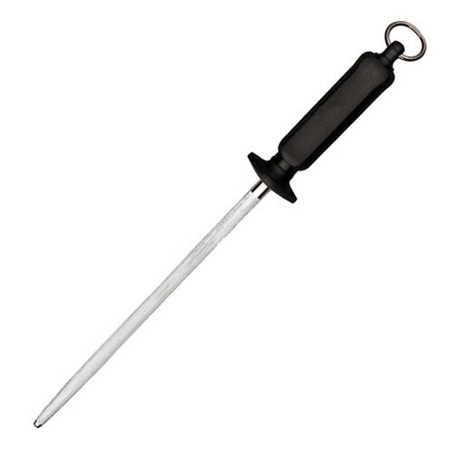 Even a good knife will lose some of its sharpness with time. A sharpening steel, or honing steel, are rods that have a roughly ground surface that enables repairing or straightening a fine edge knife. It is important to ensure the hardness of the material in the sharpening steel exceeds that of the knife, or you may damage both pieces. Available in a variety of lengths, steels are slightly magnetic so they'll pick up particles of metal removed from the knife during honing. Over time, the honing steel surface becomes smooth and needs to be replaced. A neglected knife that is too dull cannot be repaired through honing and must be re-sharpened. Length: 10"/260 mm.