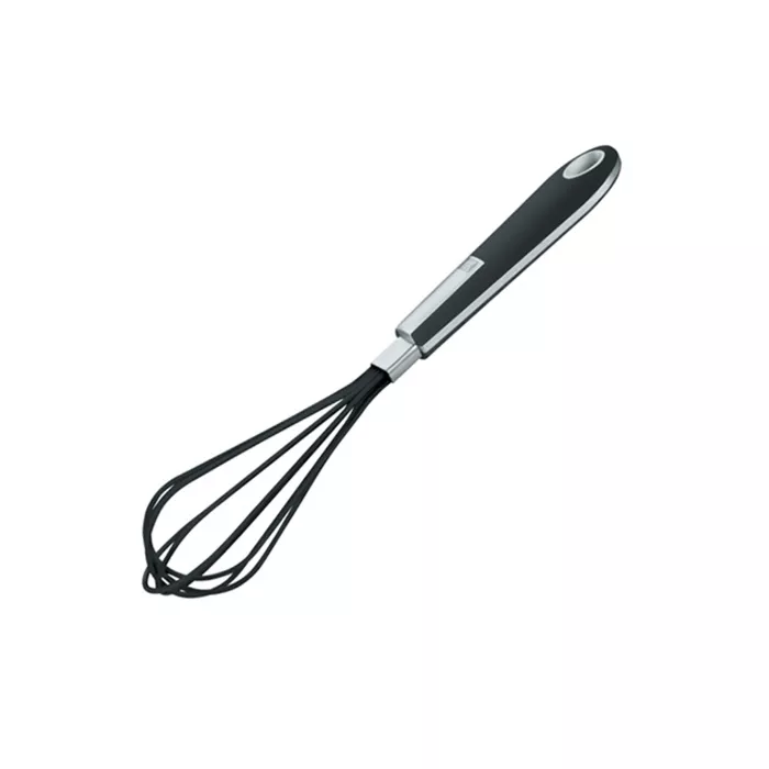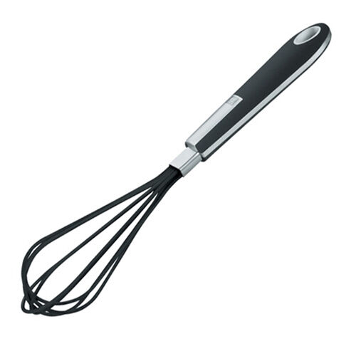 A bulb shaped head makes the whisk a prefect tool for beating eggs, whipping cream or blending batters, puddings and sauces. Silicone coated wires prevent scratching and is heat resistant up to 600F. This premium gadget offers a unique ergonomic, patented handle design which combines the comfort and sure grip control of soft rubber with the stylish accent of 18/10 stainless steel. Dishwasher safe.
