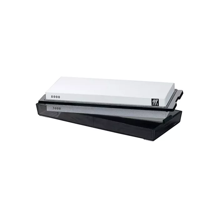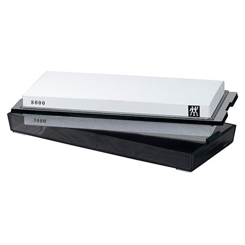 Even a good knife will lose some of its sharpness with time. Sharpening a knife can be easy if you have the right tools and know how to use them. A sharpening stone, or whet stone, is the best method of sharpening fine edge knives because of the control it allows. Like sandpaper, sharpening stones come in a variety of roughness or grit; the coarser the finish the more abrasive. For regular sharpening with a stone, use the TWIN® Stone Pro (250 and 1000 grit). The TWIN® Finishing Stone Pro is used to obtain a scalpel-like mirror finished edge (3000 and 8000 grit). The stone is a ceramic, manufactured materials that require minimal water and last longer than natural stones. TWIN® Finishing Stone Pro is a dual finishing whet stone with an extra fine 3000 grit and a polishing 8000 grit. Made in Japan. Size: 1.5" x 3.3" x 7.8".
